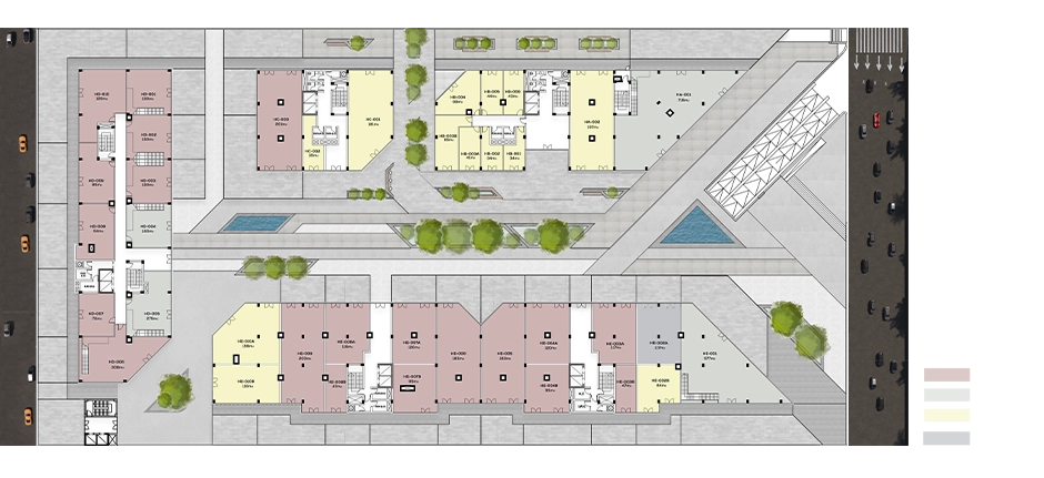 The total land area of h:rs Business Hub is 11,003 sqm (2.62 Acre), carefully distributed to create balance between built spaces and open areas.